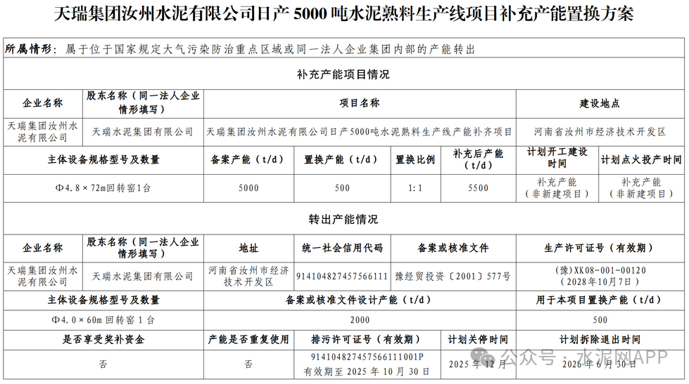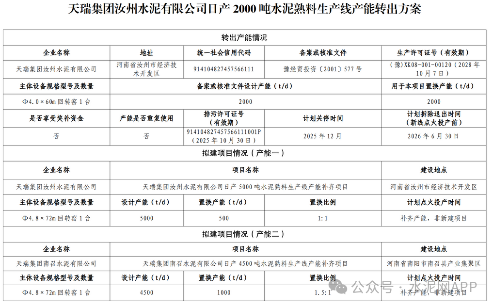 9月18日,河南省平頂山市工信局發(fā)布“關于天瑞集團汝州水泥有限公司日產5000噸水泥熟料生產線項目補充產能置換方案及天瑞集團汝州水泥有限公司日產2000噸水泥熟料生產線產能轉出方案的公示”。
