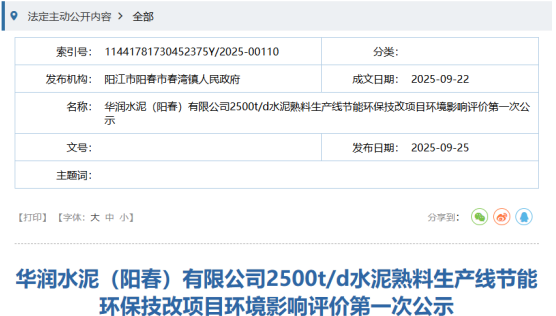 近日,廣東省陽江市陽春市春灣鎮(zhèn)人民政府網(wǎng)站發(fā)布了華潤水泥(陽春)有限公司2500t/d水泥熟料生產(chǎn)線節(jié)能環(huán)保技改項目環(huán)境影響評價第一次公示。