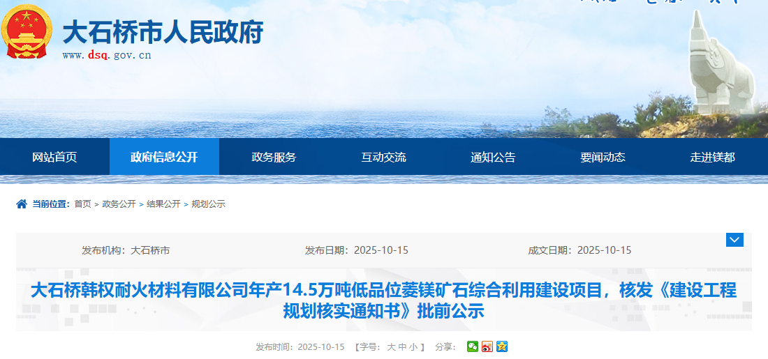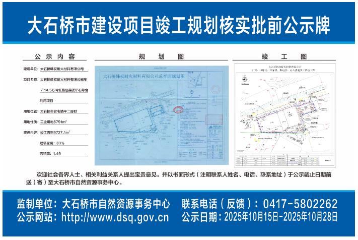 大石橋韓權(quán)耐火材料有限公司年產(chǎn)14.5萬(wàn)噸低品位菱鎂礦石綜合利用建設(shè)項(xiàng)目,核發(fā)《建設(shè)工程規(guī)劃核實(shí)通知書(shū)》批前公示