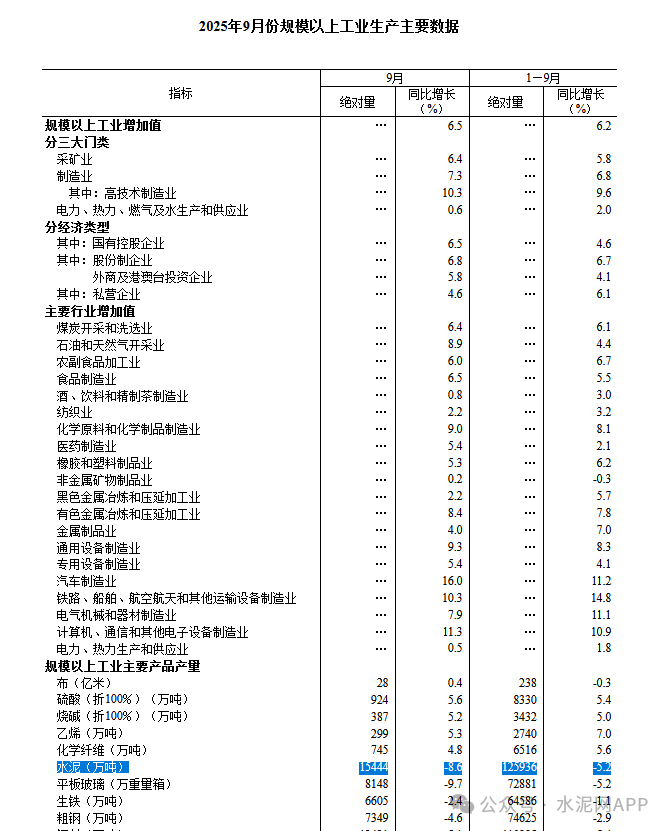 據(jù)國(guó)家統(tǒng)計(jì)局?jǐn)?shù)據(jù),9月份,規(guī)模以上工業(yè)增加值同比實(shí)際增長(zhǎng)6.5%(增加值增速均為扣除價(jià)格因素的實(shí)際增長(zhǎng)率)。從環(huán)比看,9月份,規(guī)模以上工業(yè)增加值比上月增長(zhǎng)0.64%。1—9月份,規(guī)模以上工業(yè)增加值同比增長(zhǎng)6.2%。其中水泥行業(yè)9月份產(chǎn)量15444萬噸,同比下降8.6%,1-9月全國(guó)水泥產(chǎn)量125936萬噸,同比下降5.2%。此外,數(shù)據(jù)顯示,2024年1-9月全國(guó)水泥產(chǎn)量為132670萬噸,由此計(jì)算,今年1-9月水泥全口徑產(chǎn)量比去年同期減少6734萬噸,降幅5.08%。