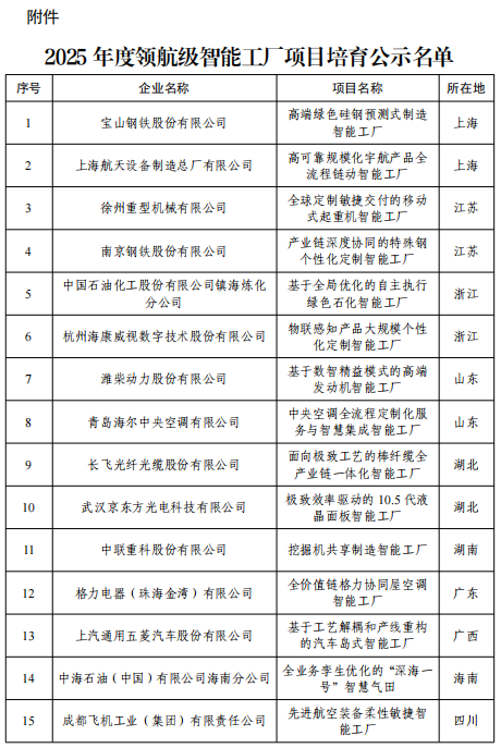 附件:2025年度領(lǐng)航級(jí)智能工廠項(xiàng)目培育公示名單
