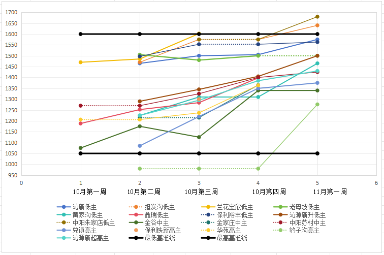 第三階段(10月第四周 - 11月第一周):呈現(xiàn)“高位沖刺” 態(tài)勢,如沁新低硫主焦?jié)q至1575元/噸;中陽朱家店低硫主焦沖至1680 元/噸;擔(dān)炭溝低硫主焦從1575元/噸躍升至1640元/噸;豹子溝高硫主焦從980元/噸沖至1276元/噸。