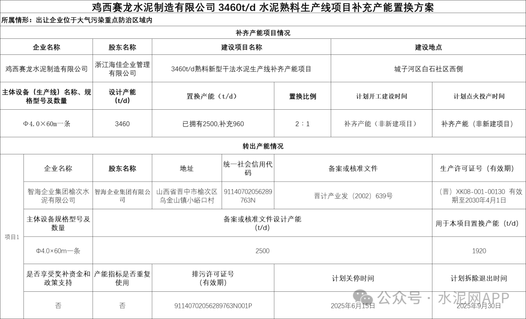 置換方案顯示,雞西賽龍水泥制造有限公司一條2500t/d熟料生產(chǎn)線補(bǔ)充產(chǎn)能960t/d,補(bǔ)充后產(chǎn)能3460t/d,退出產(chǎn)能來(lái)自智海企業(yè)集團(tuán)榆次水泥有限公司一條2500t/d熟料線(用于本項(xiàng)目1920t/d),置換比例2:1。