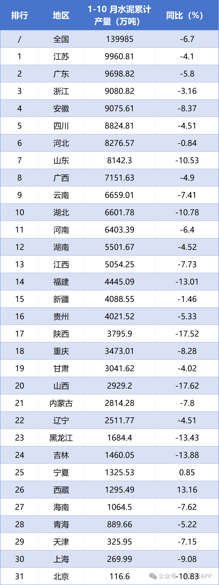 據(jù)國家統(tǒng)計局數(shù)據(jù)顯示,1-10月全國水泥產(chǎn)量139985萬噸,同比下降6.7%。從分省市數(shù)據(jù)來看,1-10月,江蘇以產(chǎn)量9960.81萬噸位列第一,廣東產(chǎn)量9698.82萬噸排在第二,浙江產(chǎn)量9080.82萬噸排在第三。同比方面,全國僅西藏、寧夏上升,其余地區(qū)下降,其中陜西降幅最大為 17.52%,整體水泥市場產(chǎn)量呈持續(xù)下行態(tài)勢。具體見下表: