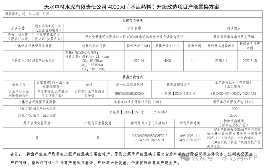 置換方案顯示,天水中材水泥擬升級(jí)改造建設(shè)一條4000t/d熟料生產(chǎn)線,退出產(chǎn)能來(lái)自同企業(yè)2*2500t/d生產(chǎn)線,置換比例1:1,剩余1000t/d產(chǎn)能有償轉(zhuǎn)給中材甘肅水泥。該項(xiàng)目計(jì)劃2026年1月1日開(kāi)工建設(shè),2027年3月15日點(diǎn)火投產(chǎn)。