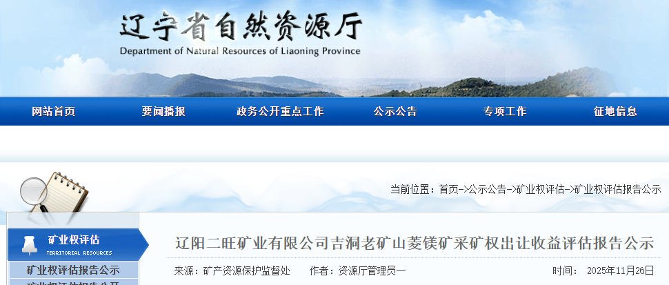 遼陽(yáng)二旺礦業(yè)有限公司吉洞老礦山菱鎂礦采礦權(quán)出讓收益評(píng)估報(bào)告通過(guò)遼寧省自然資源廳門(mén)戶網(wǎng)站向社會(huì)公示,公示10個(gè)工作日。如有異議,請(qǐng)于公示之日起10個(gè)工作日內(nèi)以電話方式先向省自然資源廳礦產(chǎn)資源保護(hù)監(jiān)督處提出簡(jiǎn)要意見(jiàn),隨后及時(shí)將書(shū)面意見(jiàn)反饋到省自然資源廳礦產(chǎn)資源保護(hù)監(jiān)督處。