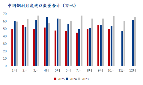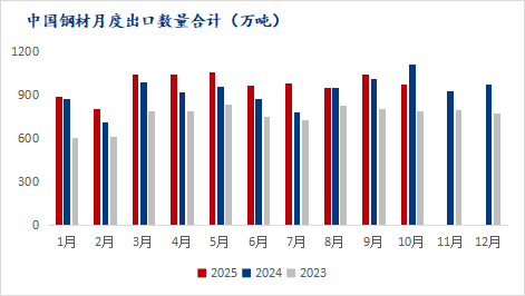 二、10月鋼材出口同比由增轉(zhuǎn)降2025年10月,中國(guó)鋼材出口量為978萬(wàn)噸,環(huán)比減少6.6%,同比減少12.3%;1-10月累計(jì)出口鋼材9774萬(wàn)噸,同比增長(zhǎng)6.6%。進(jìn)口方面,10月鋼材進(jìn)口量為50萬(wàn)噸,環(huán)比減少9.1%,同比減少6.2%;1-10月累計(jì)進(jìn)口504萬(wàn)噸,同比減少11.9%。2025年10月,我國(guó)鋼材出口同比今年首次由增轉(zhuǎn)降,主要受兩方面因素影響:一是去年同期出口基數(shù)較高,達(dá)1118萬(wàn)噸,為歷史次高月度水平;二是此前因趕船期提前透支的部分增量已在9月出口數(shù)據(jù)中顯現(xiàn)。