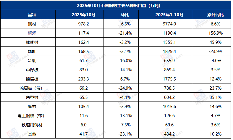 三、主要品種出口普遍回落2025年10月,中國(guó)鋼材出口各主要品種呈現(xiàn)結(jié)構(gòu)性分化,多數(shù)品類(lèi)出口量較上月有所回落。鍍層板成為少數(shù)實(shí)現(xiàn)環(huán)比正增長(zhǎng)的主要品種,出口量達(dá)203.3萬(wàn)噸,環(huán)比上升6.7%,已連續(xù)四個(gè)月超過(guò)熱軋板卷,居鋼材單品種出口量首位,反映其在國(guó)際市場(chǎng)中仍具備較強(qiáng)競(jìng)爭(zhēng)力。涂層板(帶)、冷軋板及中厚板則出現(xiàn)明顯回調(diào),顯示相關(guān)下游需求有所放緩。長(zhǎng)材方面,棒線(xiàn)材、角型材與管材出口量環(huán)比小幅回落,降幅在3%–4%之間,但累計(jì)同比保持穩(wěn)健增勢(shì),反映海外基建與結(jié)構(gòu)用鋼需求仍具韌性。整體來(lái)看,10月鋼材出口雖多數(shù)品種環(huán)比下降,但鍍層板、棒線(xiàn)材等高附加值產(chǎn)品與建筑鋼材在累計(jì)維度仍保持較好增長(zhǎng),表明中國(guó)鋼材出口結(jié)構(gòu)正隨國(guó)際需求結(jié)構(gòu)變化持續(xù)調(diào)整,不同品類(lèi)對(duì)應(yīng)終端市場(chǎng)的差異正逐步清晰。(備注:熱軋包括熱軋薄板、熱軋薄寬鋼帶、熱軋窄鋼帶和中厚寬鋼帶,冷軋包括冷軋薄板、冷軋薄寬鋼帶和冷軋窄鋼帶)