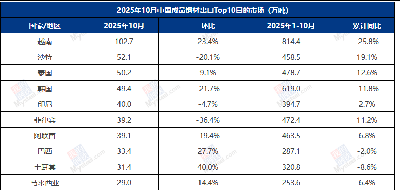 四、主要出口市場(chǎng)需求結(jié)構(gòu)分化2025年10月,中國(guó)鋼材前十大出口目的國(guó)的進(jìn)口規(guī)模出現(xiàn)明顯波動(dòng),區(qū)域間需求結(jié)構(gòu)呈現(xiàn)分化態(tài)勢(shì)。從增長(zhǎng)區(qū)域看,越南繼續(xù)保持我國(guó)鋼材第一大出口市場(chǎng)地位,當(dāng)月進(jìn)口量為102.7萬(wàn)噸,環(huán)比增長(zhǎng)23.4%,增長(zhǎng)主要來(lái)自熱軋板卷?yè)尦隹诘睦瓌?dòng)。巴西與土耳其進(jìn)口量亦顯著上升,主要受板材類(lèi)產(chǎn)品訂單增加的推動(dòng)。泰國(guó)與馬來(lái)西亞保持穩(wěn)定增長(zhǎng),主要?jiǎng)恿?lái)源于角型材需求的提升。在進(jìn)口量下降的國(guó)家中,沙特、韓國(guó)、菲律賓、阿聯(lián)酋和印尼等地10月自中國(guó)進(jìn)口鋼材規(guī)模均有不同程度回落,下降普遍集中于板材類(lèi)產(chǎn)品,反映出該類(lèi)產(chǎn)品在部分亞洲及中東地區(qū)出現(xiàn)階段性需求回調(diào)。從累計(jì)數(shù)據(jù)來(lái)看,1–10月我國(guó)對(duì)越南出口累計(jì)同比仍下降25.8%,反映其整體需求尚未恢復(fù)至去年同期水平;而對(duì)泰國(guó)、菲律賓等國(guó)的累計(jì)出口仍保持兩位數(shù)增長(zhǎng),表明我國(guó)鋼材出口格局正在向需求更為活躍的新興市場(chǎng)和復(fù)蘇區(qū)域調(diào)整??傮w而言,10月中國(guó)鋼材出口的區(qū)域變化不僅源于短期訂單波動(dòng),更折射出全球鋼材消費(fèi)市場(chǎng)正在經(jīng)歷結(jié)構(gòu)性轉(zhuǎn)變與區(qū)域需求輪動(dòng)。