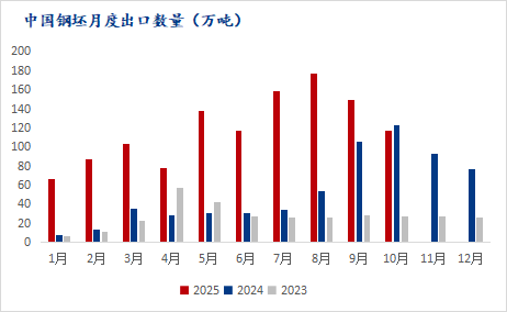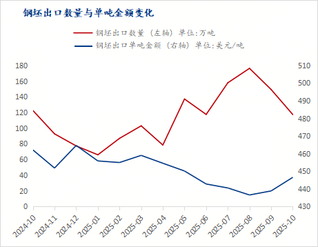 五、鋼坯出口量減價(jià)增1、10月鋼坯出口同比轉(zhuǎn)降 2025年10月,中國(guó)鋼坯出口量為117.4萬(wàn)噸,環(huán)比下降21.4%,同比下降4.3%,為今年以來(lái)首次出現(xiàn)同比負(fù)增長(zhǎng);1-10月累計(jì)出口1190.4萬(wàn)噸,雖仍保持156.9%的同比增長(zhǎng),但累計(jì)增速已呈現(xiàn)收窄態(tài)勢(shì),表明此前支撐出口的高增長(zhǎng)動(dòng)能明顯減弱。