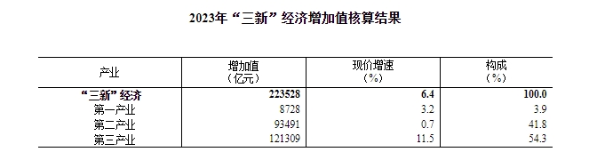 央視網消息:據(jù)國家統(tǒng)計局消息,經核算,2023年我國“三新”經濟增加值為223528億元,比上年增長6.4%(按現(xiàn)價計算,下同),比同期國內生產總值(GDP)現(xiàn)價增速高1.8個百分點;相當于GDP的比重為17.73%,比上年提高0.37個百分點。