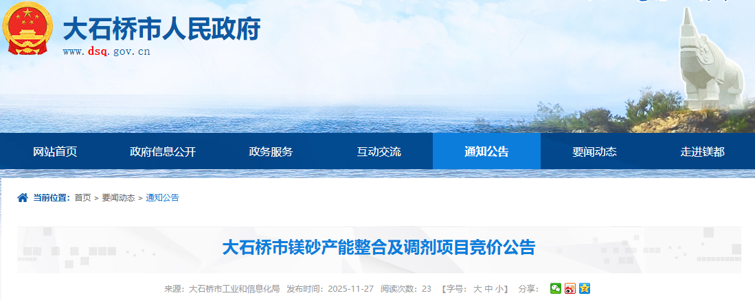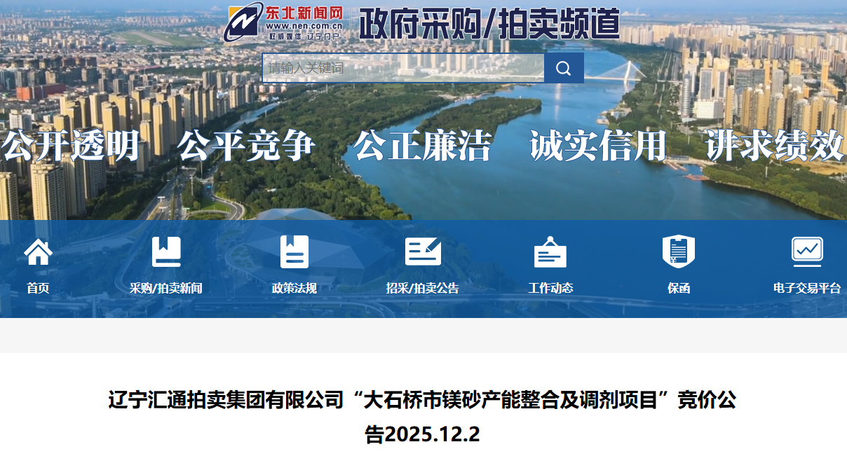 為貫徹落實大石橋市菱鎂產(chǎn)業(yè)結(jié)構(gòu)調(diào)整與轉(zhuǎn)型升級的戰(zhàn)略部署,優(yōu)化資源配置,實現(xiàn)高質(zhì)量發(fā)展。根據(jù)大石橋市鎂砂產(chǎn)能整合及調(diào)劑工作的總體安排,大石橋市政府責(zé)成大石橋市工業(yè)和信息化局委托遼寧匯通拍賣集團(tuán)有限公司,就已列入大石橋市850萬噸壓減目標(biāo)以及完成產(chǎn)能整合且已在大石橋市工業(yè)和信息化局報備的整合方企業(yè),擬于2025年12月2日組織公開競價活動,以確定產(chǎn)能整合及調(diào)劑的受讓方及補(bǔ)償金額。
