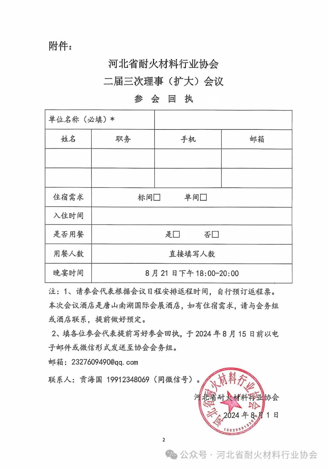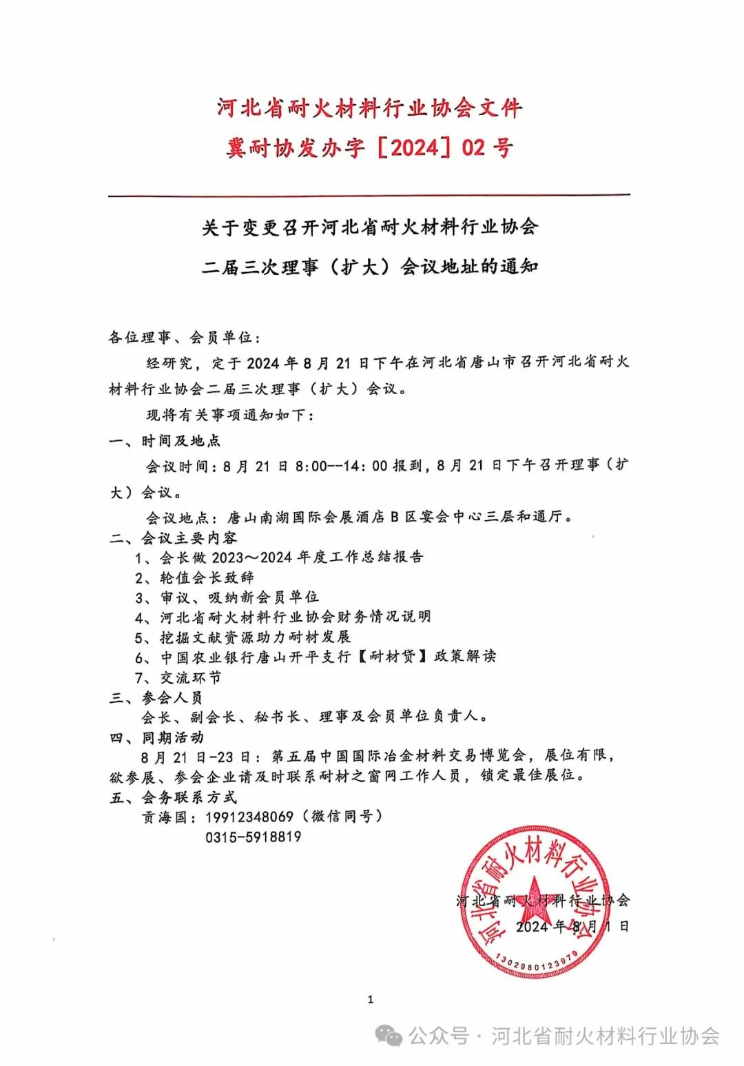 關(guān)于變更召開河北省耐火材料行業(yè)協(xié)會(huì)二屆三次理事(擴(kuò)大)會(huì)議地址的通知