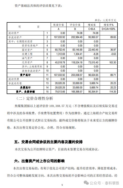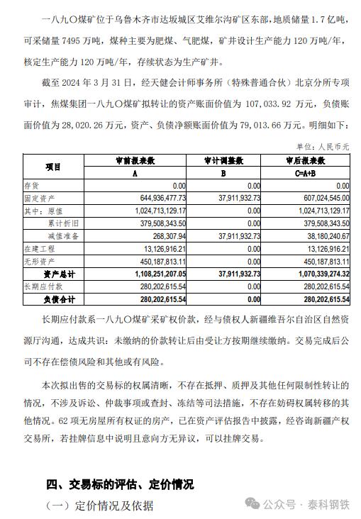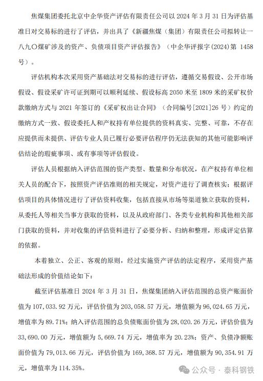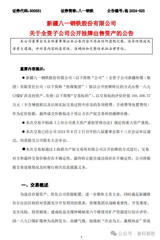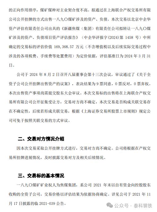 中國寶武旗下八一鋼鐵8月2日晚間發(fā)布公告稱,為盤活存量資產(chǎn)、優(yōu)化公司資源配置,進(jìn)一步聚焦主責(zé)主業(yè),同時滿足新疆維吾爾自治區(qū)政府對資源充分開發(fā)利用的要求,焦煤集團(tuán)從戰(zhàn)略重要性、開發(fā)難度、安全風(fēng)險、投資額度、建成收益及煤種稀缺度六個維度對礦產(chǎn)資源進(jìn)行綜合評價。因一八九〇煤礦煤種為高揮發(fā)分,高磷氣煤,按煉制“冷態(tài)為主、兼顧熱態(tài)”焦炭的正向作用排序,煤礦煤種對主業(yè)契合度不高。擬通過在上海聯(lián)合產(chǎn)權(quán)交易所有限公司公開掛牌的方式出售一八九〇煤礦涉及的資產(chǎn)、負(fù)債。本次交易以北京中企華資產(chǎn)評估有限責(zé)任公司出具的《新疆焦煤(集團(tuán))有限責(zé)任公司擬轉(zhuǎn)讓一八九〇煤礦涉及的資產(chǎn)、負(fù)債項(xiàng)目資產(chǎn)評估報告》中所確定的交易標(biāo)的評估價值約16.94億元為定價依據(jù),評估基準(zhǔn)日為2024年3月31日。