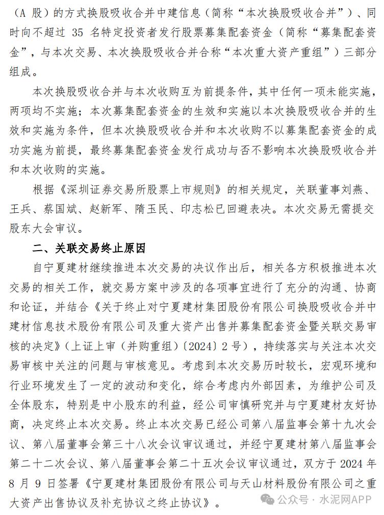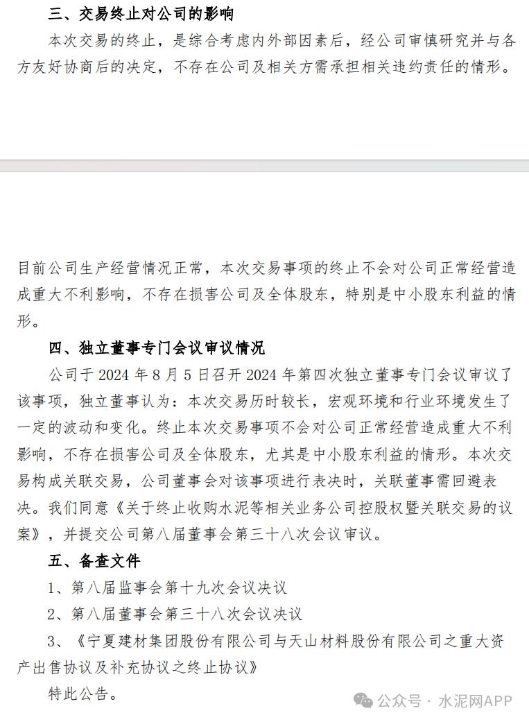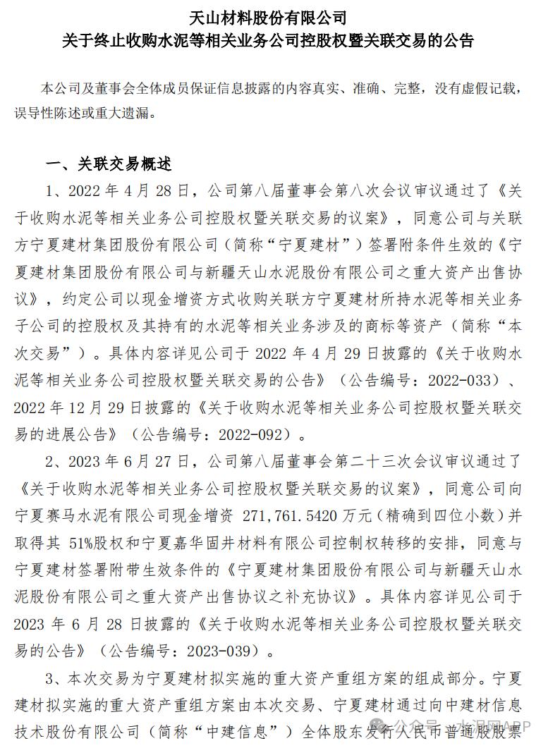 天山股份8月9日晚間公告,因交易歷時較長,宏觀環(huán)境和行業(yè)環(huán)境發(fā)生了一定的波動和變化,公司決定終止此前計劃收購關(guān)聯(lián)方寧夏建材所持水泥等相關(guān)業(yè)務(wù)子公司的控股權(quán)及其持有的水泥等相關(guān)業(yè)務(wù)涉及的商標等資產(chǎn)的交易。天山股份同時公告,公司實控人中國建材集團、控股股東中國建材股份正在積極研究論證關(guān)于基礎(chǔ)建材板塊相關(guān)企業(yè)的其他整合方案,并計劃在條件成熟后推進。