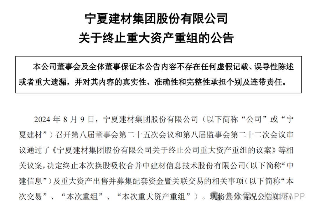 實(shí)為“老問題”未解決“當(dāng)時進(jìn)行這個重組交易主要就是為了解決我們和天山股份之間存在的同業(yè)競爭問題。目前,交易終止主要原因還是我們吸收合并的中建信息涉及的應(yīng)收賬款問題,經(jīng)過這么長時間,還是沒能梳理清晰?!?月13日下午,寧夏建材方面對記者表示。今年1月底,上交所便發(fā)布了關(guān)于終止寧夏建材吸收合并中建信息及重大資產(chǎn)出售并募集配套資金的審核決定。