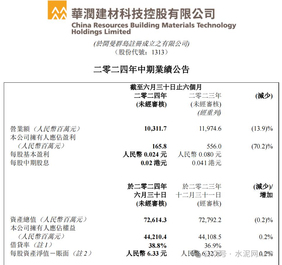 8月16日晚間,華潤建材科技發(fā)布2024年中期業(yè)績,公司上半年實(shí)現(xiàn)營業(yè)收入103.12億元,同比下滑13.9%;公司擁有人應(yīng)占盈利(歸母凈利潤)1.66億元,同比減少70.2%。