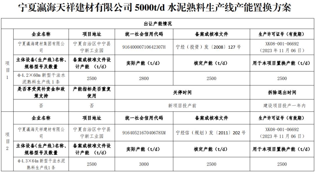 其中,包括中衛(wèi)市寧夏瀛海天祥建材有限公司2條2500t/d熟料生產(chǎn)線,退出產(chǎn)能合計(jì)150萬(wàn)噸。