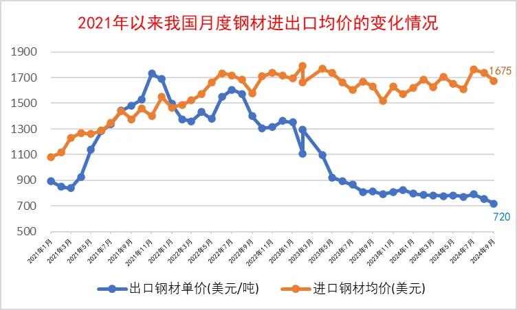 2024年9月,我國出口鋼材1015.4萬噸,環(huán)比增加65.8萬噸、增幅6.9%,同比增加209.0萬噸、增幅25.9%;平均出口單價719.6美元/噸,環(huán)比減少35.9美元/噸、降幅4.8%,同比減少94.6美元/噸、降幅11.6%。1-9月,我國累計出口鋼材8071.2萬噸,同比增加1389.4萬噸、增幅20.8%;累計平均出口單價769.9美元/噸,同比減少215.8美元/噸、降幅21.9%;累計出口鋼坯341.2萬噸,同比增加93.9萬噸、增幅38.0%;折合粗鋼凈出口8015萬噸,同比增加1645萬噸、增幅25.8%。2024年9月,我國進(jìn)口鋼材55.4萬噸,環(huán)比增加4.5萬噸、增幅8.8%,同比減少8.7萬噸、降幅13.6%;平均進(jìn)口單價1675.5美元/噸,環(huán)比減少65.5美元/噸、降幅3.8%,同比增加43.5美元/噸、增幅2.7%。1-9月,我國累計進(jìn)口鋼材518.5萬噸,同比減少51.3萬噸、降幅9.0%;累計平均進(jìn)口單價1673.4美元/噸,同比減少15.2美元/噸、降幅0.9%;累計進(jìn)口鋼坯160.3萬噸,同比減少37.6萬噸、降幅19.0%。