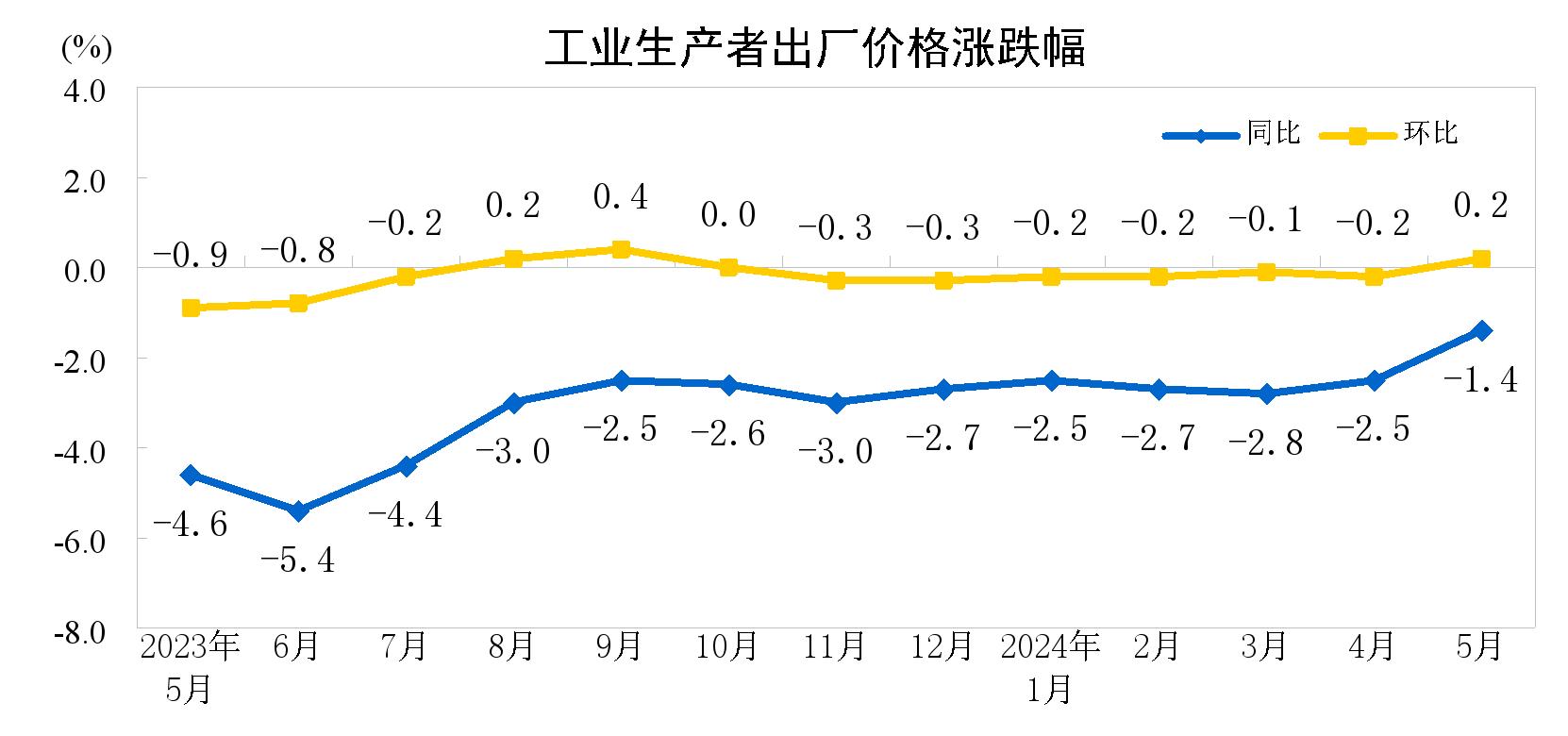 央視網(wǎng)消息:據(jù)國(guó)家統(tǒng)計(jì)局網(wǎng)站消息,2024年5月份,全國(guó)工業(yè)生產(chǎn)者出廠價(jià)格同比下降1.4%,降幅比上月收窄1.1個(gè)百分點(diǎn),環(huán)比上漲0.2%,上月為下降0.2%;工業(yè)生產(chǎn)者購(gòu)進(jìn)價(jià)格同比下降1.7%,環(huán)比上漲0.3%。1—5月平均,工業(yè)生產(chǎn)者出廠價(jià)格比上年同期下降2.4%,工業(yè)生產(chǎn)者購(gòu)進(jìn)價(jià)格下降3.0%。