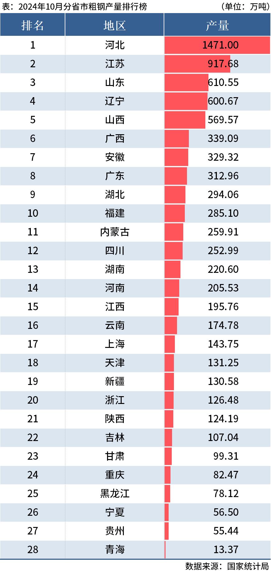 國家統(tǒng)計局:前10月全國分省市粗鋼產(chǎn)量出爐