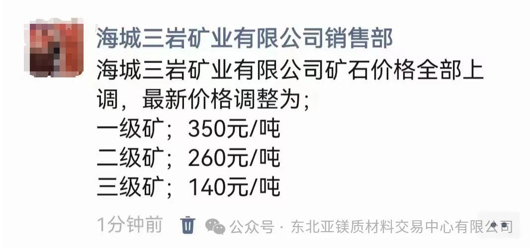同時(shí),金鼎集團(tuán)也給出礦石新報(bào)價(jià),海鎂集團(tuán)再次更新了幾天前剛剛公示的菱鎂礦石報(bào)價(jià)。