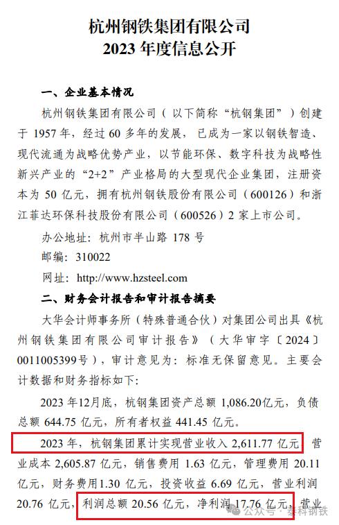 2024年6月24日,杭鋼集團(tuán)發(fā)布2023年度信息公開!2023年,杭鋼集團(tuán)累計(jì)實(shí)現(xiàn)營業(yè)收入2,611.77億元,營 業(yè)成本2,605.87億元,銷售費(fèi)用 1.63億元,管理費(fèi)用20.11億元,財(cái)務(wù)費(fèi)用1.30億元,投資收益6.69億元,營業(yè)利潤20.76億元,利潤總額20.56億元,凈利潤17.76億元。營業(yè)利潤率0.79%,凈資產(chǎn)收益率4.08%。