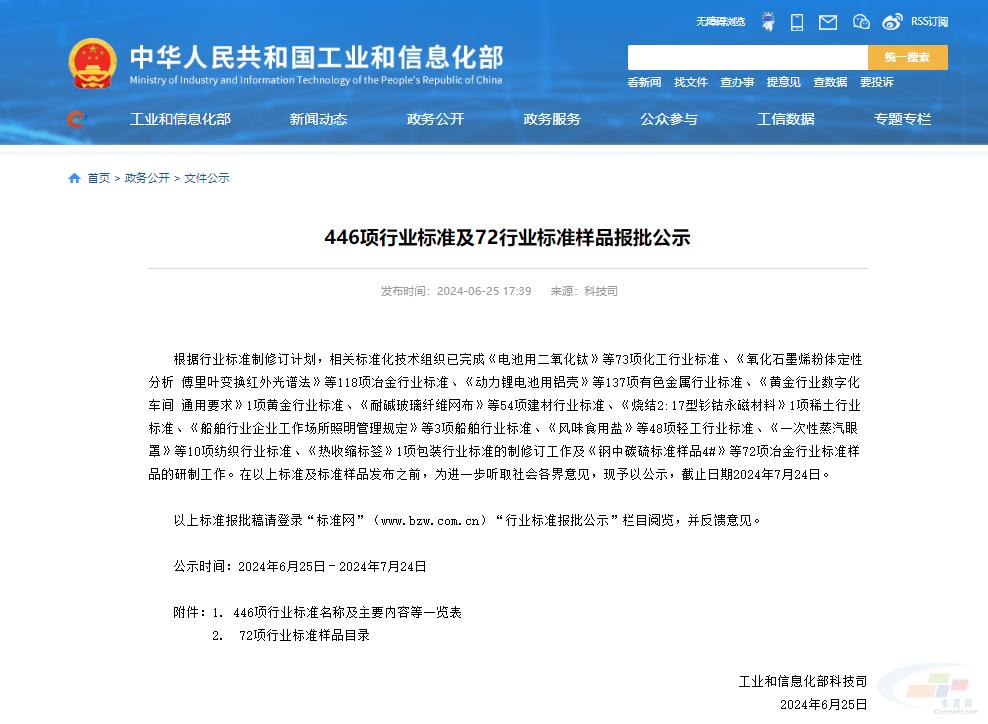 6月25日,工信部公示了446項行業(yè)標準及72項行業(yè)標準樣品。公示時間為2024年6月25日-2024年7月24日。