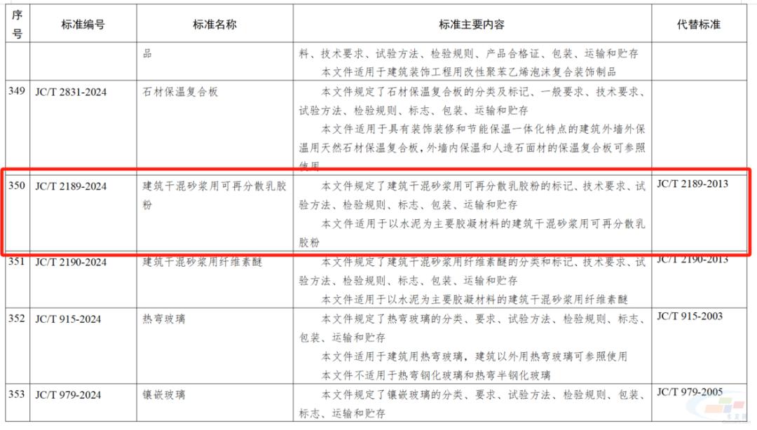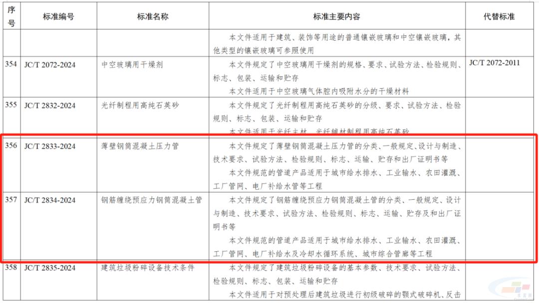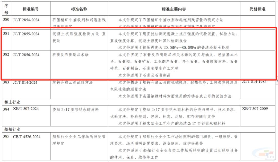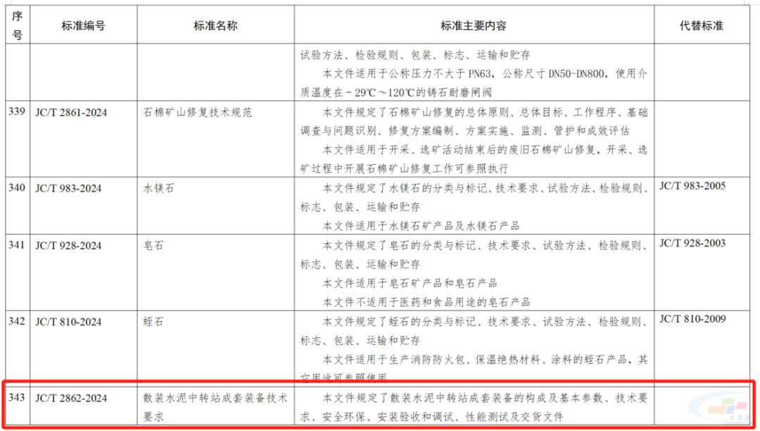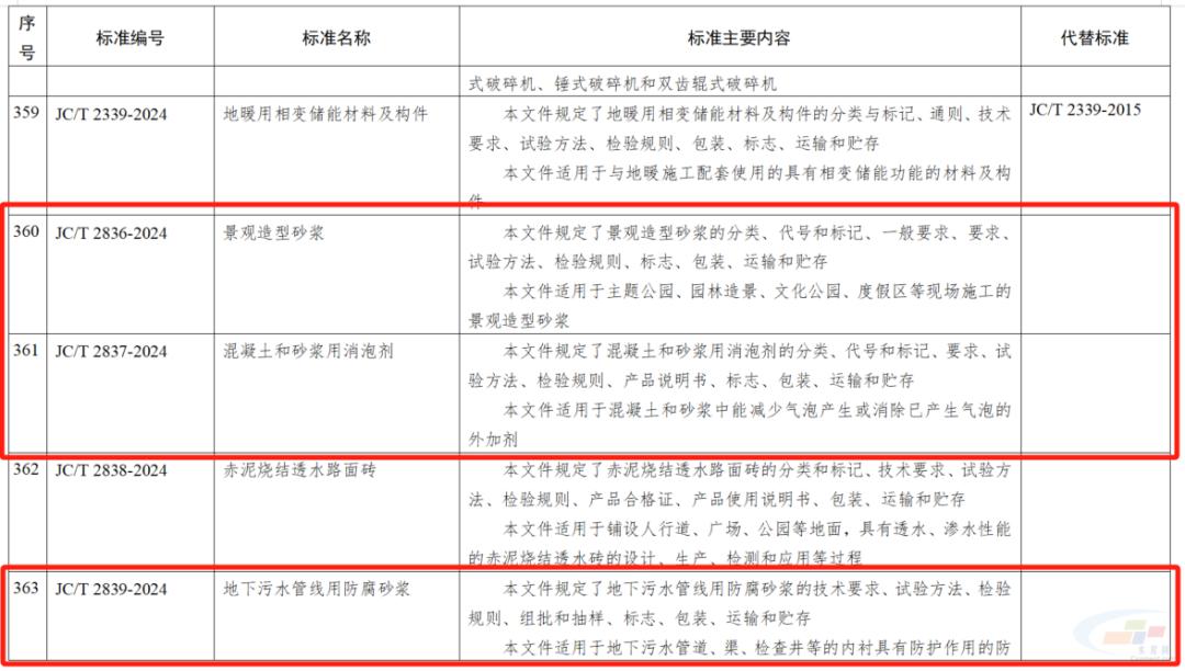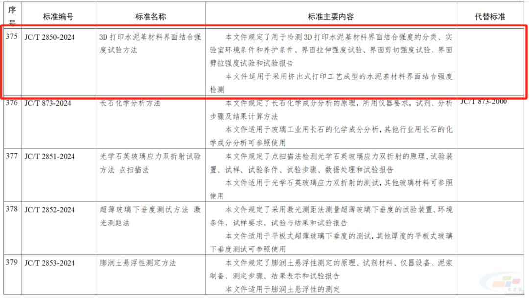 其中,海工低熱硅酸鹽水泥;高溫固井用硅酸鹽水泥;水泥和混凝土用脫硫錳渣;散裝水泥中轉站成套裝備技術要求;彩色透水地坪技術要求;高延性纖維增強水泥基復合材料;建筑干混砂漿用可再分散乳膠粉;薄壁鋼筒混凝土壓力管;鋼筋纏繞預應力鋼筒混凝土管;景觀造型砂漿;混凝土和砂漿用消泡劑;地下污水管線用防腐砂漿;3D打印水泥基材料界面結合強度試驗方法;混凝土抗壓強度檢測方法 直拔法;石膏及石膏制品術語被列入446項行業(yè)標準中。