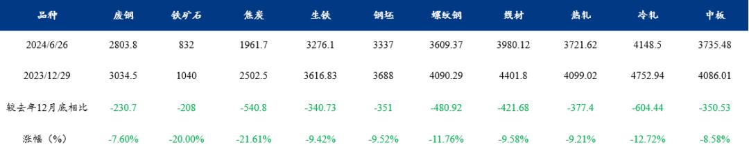 2024年上半年已經(jīng)過去,黑色系各品種均出現(xiàn)了不同幅度的下跌,其中:廢鋼跌幅7.60%;鐵礦石跌幅20.00%;焦炭跌幅21.61%;鋼坯跌幅9.52%;螺紋鋼跌幅11.76%;熱軋、冷軋和中板跌幅分別為9.21%、12.72%和8.58%。