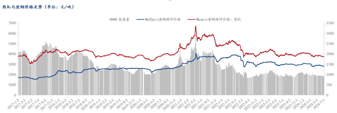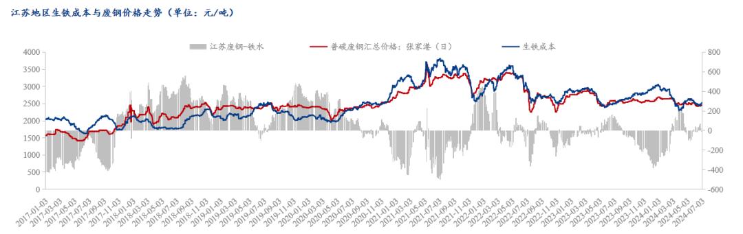 2024年上半年,鐵廢差來(lái)看,廢鋼多數(shù)時(shí)間仍是倒掛鐵水成本,鐵廢差平均值-36.68元/噸,較2023年平均值-55元/噸回升18.32元/噸,廢鋼整體性價(jià)比優(yōu)勢(shì)較2023年有所減弱。