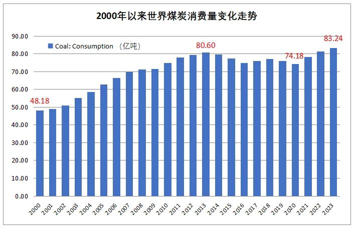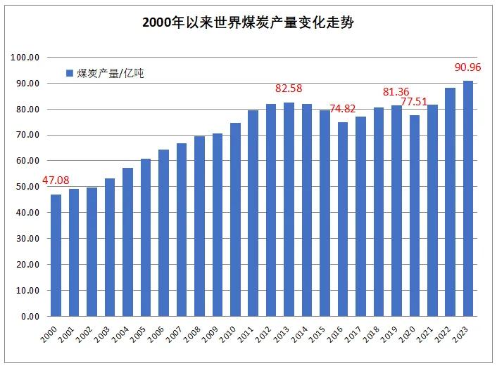 統(tǒng)計(jì)年鑒數(shù)據(jù)顯示,2023年,世界煤炭總產(chǎn)量為90.957億噸(179.24艾焦耳),比2022年增長(zhǎng)3.1%,全球產(chǎn)量首次突破90億噸,創(chuàng)出歷史新紀(jì)錄。