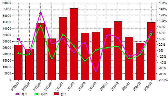 2024年3月份印度鎂砂進(jìn)口量44,945.32公噸,去年同期為27,420.63公噸,上月為28,736.73公噸,同比上升63.91%,環(huán)比上升56.40%。