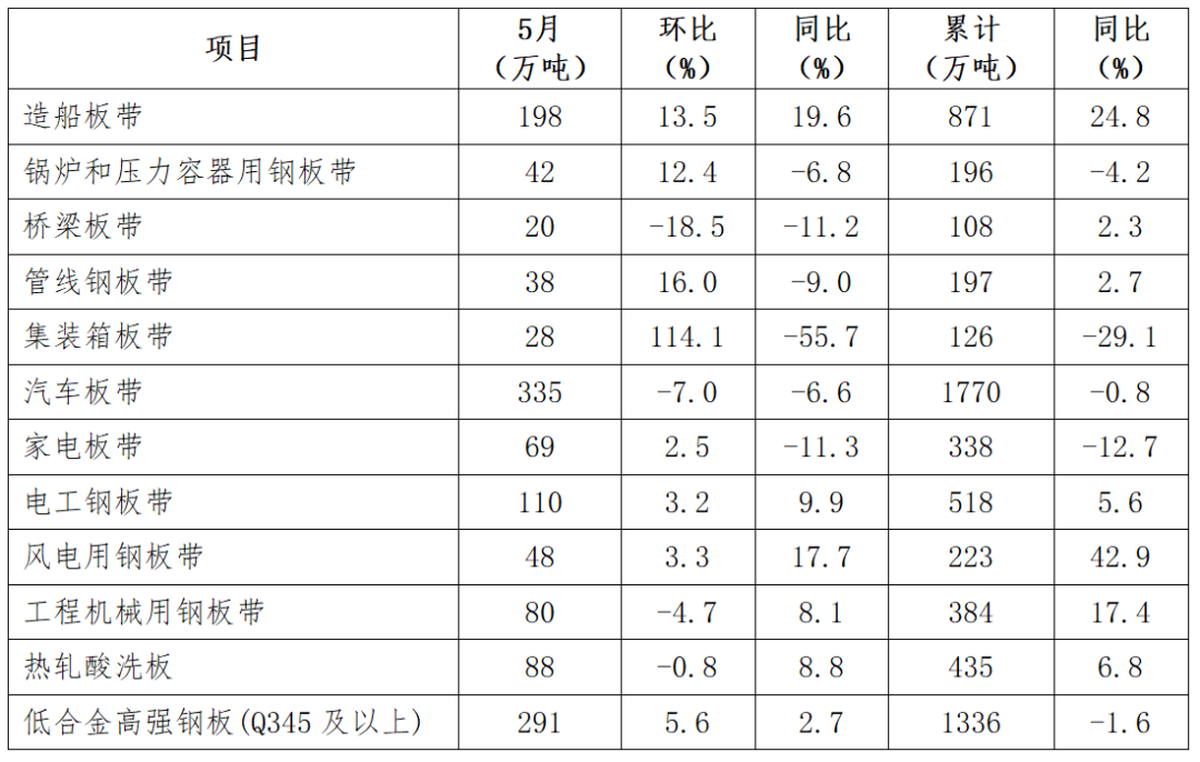2025年5月,重點(diǎn)統(tǒng)計企業(yè)主要品種板中,造船板、風(fēng)電用鋼板產(chǎn)量同比增幅較大;集裝箱板、橋梁板、家電板產(chǎn)量同比降幅較大。