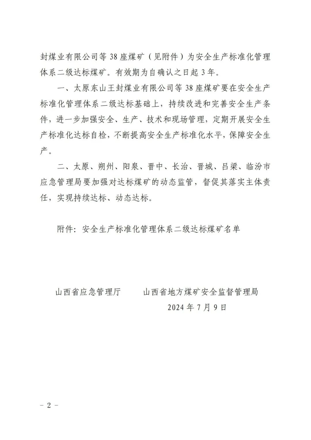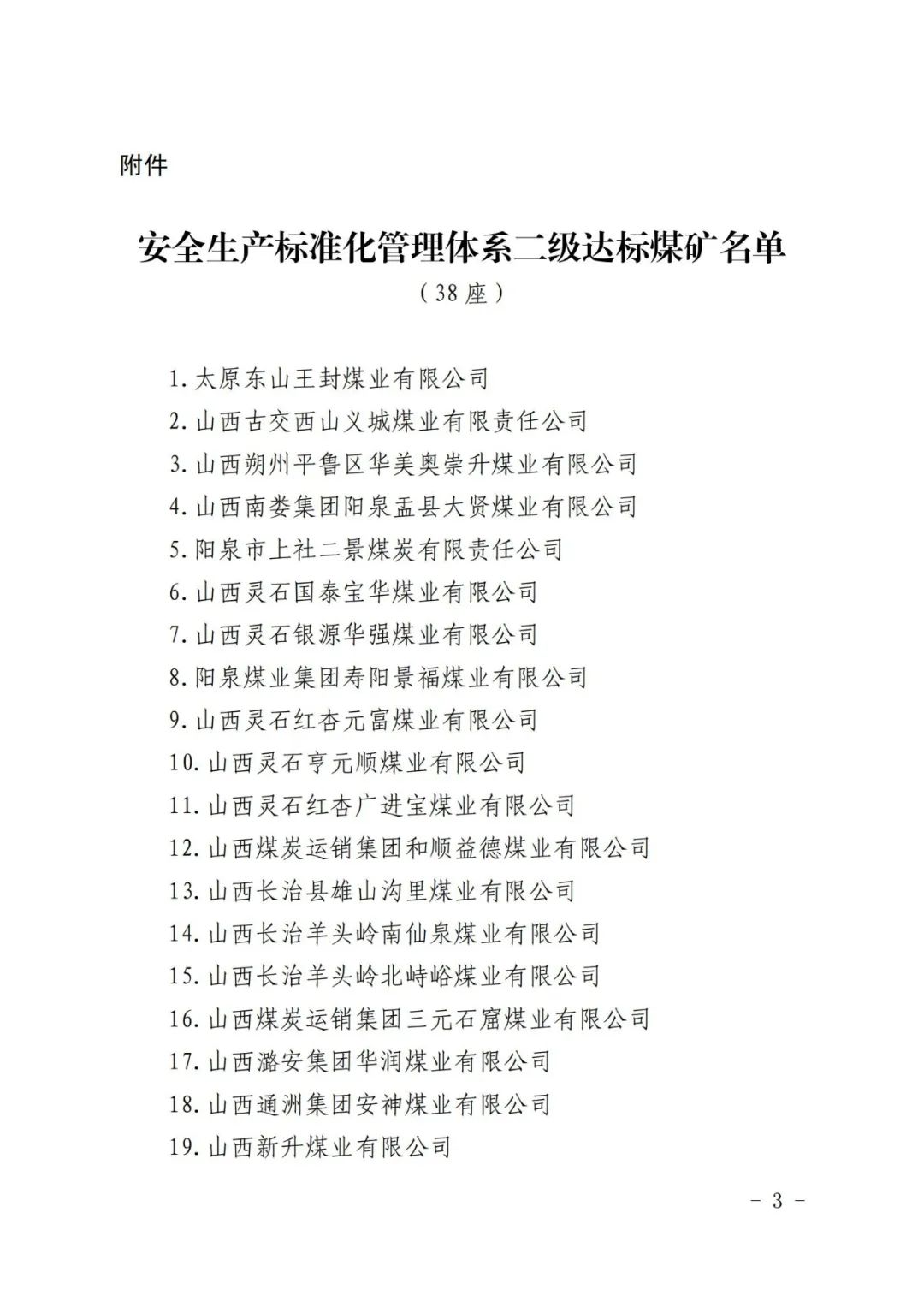 山西38座煤礦為安全生產(chǎn)標(biāo)準(zhǔn)化管理體系二級(jí)達(dá)標(biāo)煤礦