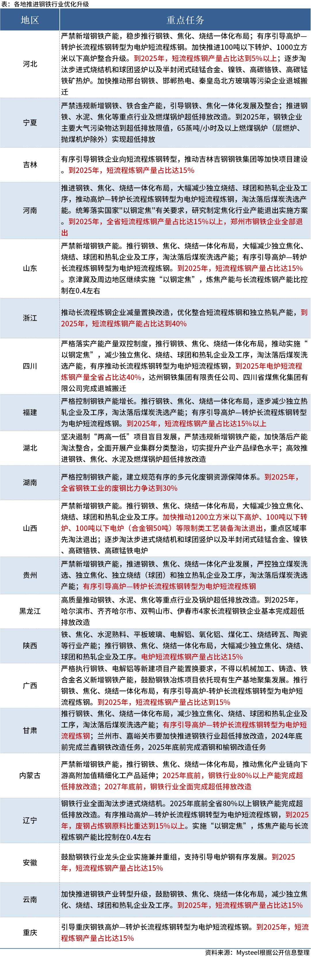 據(jù)不完全統(tǒng)計,21個省份出臺“空氣質(zhì)量持續(xù)改善行動實施方案”,要求推進鋼鐵等重點行業(yè)優(yōu)化升級,包括嚴禁新增鋼鐵產(chǎn)能,提出短流程煉鋼比例的目標等。多地提出到2025年,短流程煉鋼產(chǎn)量占比達到15%,浙江、四川到2025年短流程煉鋼產(chǎn)量占比達到40%。