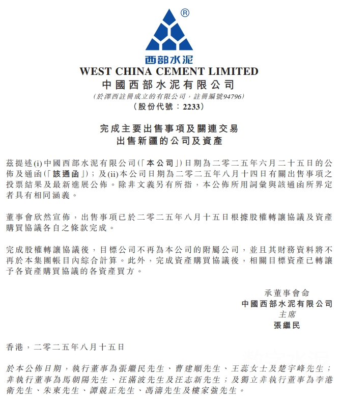 6月25日晚,西部水泥發(fā)布公告稱,擬出售旗下新疆的公司和資產(chǎn),各目標(biāo)公司均主要從事水泥及水泥產(chǎn)品的制造及銷售、石灰石及建筑材料的銷售以及提供廢物處理服務(wù)的公司,累計作價16.5億。