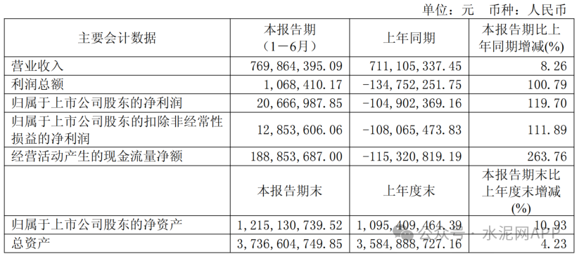 福建水泥8月23日披露2025年半年度報告。2025年上半年,公司實現(xiàn)營業(yè)總收入7.7億元,同比增長8.26%;歸母凈利潤2066.7萬元,同比扭虧。